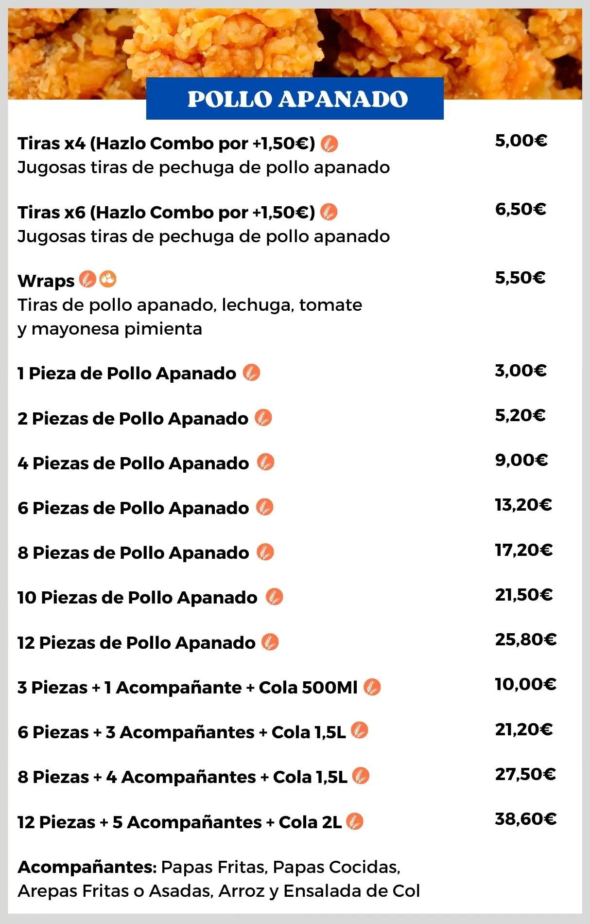 Comida económica, excelente calidad precio, no tienes que esperar mucho, buena atención, delicioso pollo apañado.